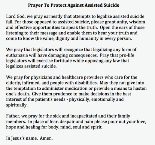 Advocates for assisted suicide are going to attempt to legalize it in Illinois during the upcoming veto session. Please pray for the defeat of this lethal legislation every day until Nov. 9 (the end of the veto session). The veto session convenes in Springfield from Oct. 24-26 and again from Nov. 7-9.