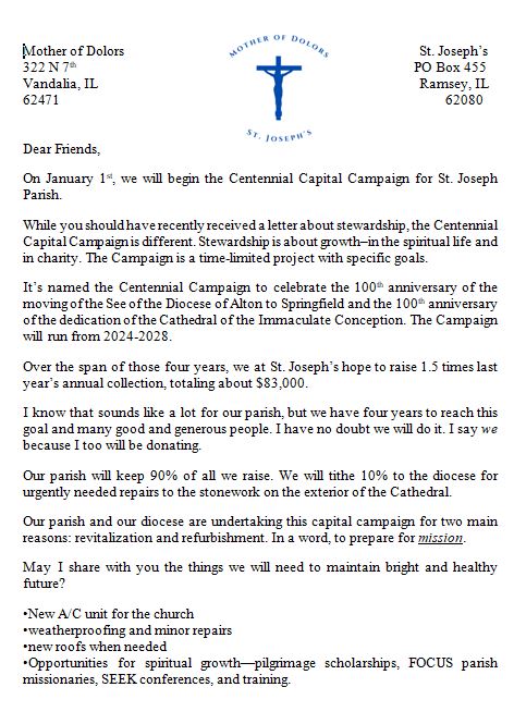 St. Joseph’s Church Centennial Campaign will begin Jan 1, 2024 and end Dec. 2028. There is an Campaign envelope in the envelope packets you receive. If you drop a check in the collection basket, please put “Campaign” in the memo line, so it is appropriated to the correct category.